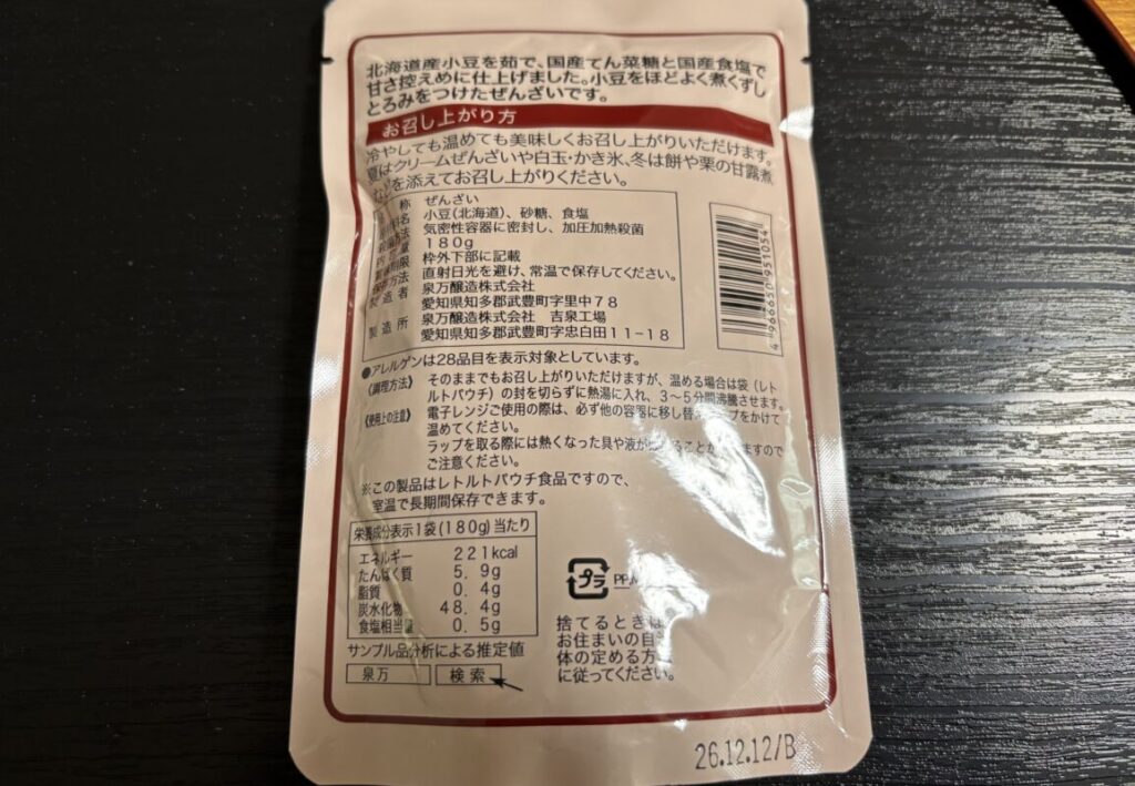 イズマン 甘さひかえめ ぜんざい (パッケージより)